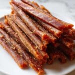The image shows a pile of long, thin, dried meat sticks stacked neatly on a white plate. The sticks have a rich reddish-brown color with darker edges and a slightly rough texture covered with small, light-colored seasoning specks. They are arranged in overlapping layers, forming a small mountain in the center of the plate, which sits on a white marbled surface. The lighting highlights the glossy, slightly oily surface of the meat sticks, making them look flavorful and tender. Photo taken with an iphone --ar 4:5 --v 7