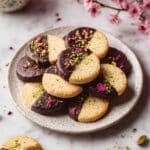 - Dip and Decorate: Dip half of each cooled cookie into melted chocolate. Place on lined baking sheet and sprinkle with chopped pistachios and freeze-dried raspberries while chocolate is wet.