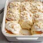 - Finish and serve. Spread frosting over warm rolls and sprinkle with slivered almonds. Serve warm and enjoy.