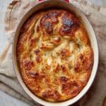A golden brown baked dish with a rustic, uneven top crust that has some bubbly and crisp textures. The crust shows hints of folded dough layers with slightly darker brown spots, revealing small chunks of a light-colored filling peeking through. The dish is inside a white oval pot with a red handle, which sits on a beige cloth over a white marbled surface. Photo taken with an iphone --ar 4:5 --v 7