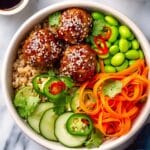 - Step 9: To assemble the bowls, place cooked brown rice in each bowl. Top with 4-5 meatballs, sliced cucumber, jalapeño (if using), carrot ribbons, edamame, sesame seeds, chopped cilantro, and extra sauce as desired.