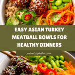 These Asian Turkey Meatball Bowls are a flavorful and healthy dish featuring lean turkey meatballs baked to perfection and coated in a tangy, slightly spicy sauce. Served over brown rice with fresh veggies like cucumber, carrot ribbons, edamame, and jalapeño, they offer a satisfying combination of textures and vibrant flavors perfect for a nutritious lunch or dinner.