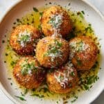 Authentic Baked Arancini are crispy Italian rice balls stuffed with melty mozzarella cheese, coated in breadcrumbs, and baked to golden perfection. Using Arborio rice cooked in chicken broth, this recipe offers a healthier twist to traditional fried arancini, delivering a comforting, cheesy, and flavorful appetizer or snack.