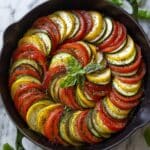 This Baked Ratatouille recipe features tender slices of eggplant, zucchini, squash, and tomatoes arranged beautifully over a flavorful, homemade tomato sauce. Sautéed onions, bell peppers, and garlic enhance the base sauce, which is blended smooth, then topped with seasoned vegetables and baked to perfection. This healthy, comforting dish bursts with Mediterranean flavors and is perfect as a side or main course.