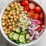 A vibrant and refreshing Mediterranean Chickpea Feta Salad featuring crisp cucumbers, juicy cherry tomatoes, tangy feta cheese, and a zesty lemon-oregano dressing. This easy no-cook salad combines the flavors of fresh herbs, Kalamata olives, and garlic for a wholesome, protein-rich dish perfect for lunch, dinner, or as a side.