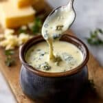 A close-up image of a small dark brown ceramic pot filled with creamy, light yellow sauce dotted with small chunks of blue cheese. A silver spoon is scooping some of the sauce, showing its thick but smooth texture as it drips back into the pot. The background shows a blurred wooden cutting board with cheese pieces and some green herbs, all placed on a white marbled surface. photo taken with an iphone --ar 4:5 --v 7