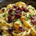 This image features a bowl of creamy pasta coated in a rich, velvety sauce, topped with vibrant red dried cranberries and a sprinkle of fresh green herbs, creating a visually appealing contrast of colors and textures. The pasta looks perfectly cooked and the sauce appears smooth and luscious, promising a flavorful and comforting dish. photo taken with an iPhone --ar 4:5 --v 7