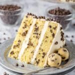 Keywords: Chocolate chip cookie dough cake, layered cake, cookie dough frosting, chocolate chip cake, dessert, birthday cake