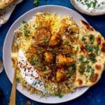 A fragrant and flavorful Chicken Biryani featuring tender marinated chicken thigh fillets cooked with aromatic spices, basmati rice, and topped with fried onions and toasted almonds. This traditional Indian dish is layered and slow-cooked to infuse rich flavors, served with natural yogurt and fresh herbs.