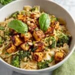 A white bowl filled with a colorful pasta dish featuring layers of light beige bowtie pasta at the base, topped with bright green broccoli florets spread evenly throughout. On top, golden-brown cubed pieces of grilled or roasted paneer or tofu add a crispy texture, sprinkled with small off-white pine nuts and chopped fresh green herbs. Two fresh green basil leaves rest on the top layer, adding a pop of color. The bowl is placed on a white marbled surface with hints of a green cloth nearby. photo taken with an iphone --ar 4:5 --v 7