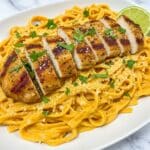 A close-up view of a creamy pasta dish served on a white plate with a white marbled texture background. The bottom layer consists of wide, flat noodles coated in a rich, light orange creamy sauce, with a smooth and slightly glossy texture. On top are golden-brown grilled chicken pieces, seasoned and slightly charred, scattered evenly across the noodles. Finely chopped green herbs are sprinkled over everything, adding bursts of color. A light dusting of grated cheese is also visible on the chicken and pasta. A lime wedge is partially visible in the top right corner, adding a fresh green touch. Photo taken with an iphone --ar 4:5 --v 7