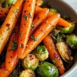 Keywords: crispy roasted carrots, maple glazed Brussels sprouts, roasted vegetables, vegan side dish, healthy roasted veggies