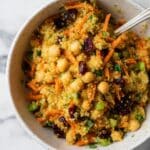 This Curried Chickpea Quinoa Salad is a vibrant, protein-packed dish combining fluffy quinoa, hearty chickpeas, and a flavorful medley of fresh vegetables and dried cranberries. Tossed in a creamy tahini and curry spiced dressing with a hint of maple syrup and lemon juice, it offers a delightful balance of sweet, tangy, and savory flavors—perfect as a nutritious main or side salad.