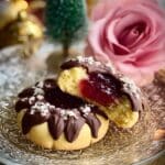 The image showcases a beautifully crafted jelly-filled cookie with a chocolate-dipped edge and sprinkled with small white almond or nut pieces. The cookie has a rich, inviting appearance with a glossy, deep red jelly center that contrasts with the light yellow dough and dark chocolate coating. It is presented on a textured glass plate, accompanied by a decorative pink rose and a festive background featuring a small green Christmas tree and golden accents, evoking a cozy and elegant holiday atmosphere. Photo taken with an iPhone --ar 4:5 --v 7