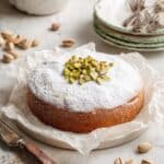 - Decorate and Serve: Dust the top with powdered sugar and sprinkle extra crushed pistachios for garnish. Serve warm or at room temperature.