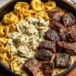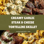 This Garlic Steak & Cheese-Filled Tortellini Skillet is a rich and satisfying one-pan meal featuring tender seared steak cubes, cheese-stuffed tortellini, and a creamy garlic Parmesan sauce. Perfect for a cozy dinner, it combines hearty proteins with comforting pasta in a luscious skillet dish.