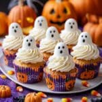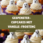 Diese Halloween-Geister-Cupcakes sind perfekte gruselige Leckereien für die schaurige Jahreszeit. Mit einem saftigen Vanille-Buttermilch-Teig und einem fluffigen Vanille-Frosting, verziert mit süßen Geistergesichtern aus schwarzem Dekorgel oder Mini-Schokotropfen, sorgen sie für schaurigen Genuss auf jeder Halloween-Party.