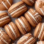 These Gingerbread Macarons are a festive twist on classic French macarons, featuring warm gingerbread spices in the delicate almond meringue shells, accented with a silky molasses buttercream filling. Perfectly crisp on the outside and chewy inside, these macarons are decorated with melted white chocolate and gingerbread men sprinkles for a charming holiday treat.