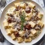 This decadent Gorgonzola Truffle Cream Mushrooms recipe features sautéed mushrooms enveloped in a rich and creamy sauce made with gorgonzola cheese and white truffle oil. Enhanced with fragrant herbs like sage, oregano, and thyme, this sauce pairs perfectly with pasta, creating an indulgent yet simple dish that is perfect for special occasions or elevating a weeknight dinner.