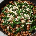A delicious and quick Ground Beef and Spinach Skillet with Feta cheese, offering a perfect balance of savory flavors and fresh greens. This one-pan dish is easy to prepare, making it ideal for weeknight dinners.