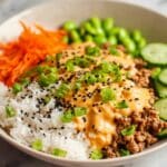 This Ground Turkey Rice Bowl with Bang Bang Sauce is a flavorful and vibrant meal perfect for a quick weeknight dinner. Lean ground turkey is cooked with aromatic garlic, ginger, and spices, then combined with a luscious homemade bang bang sauce. Served over rice and fresh veggies like shredded carrots, cucumbers, edamame, and avocado, this dish offers a well-balanced combination of protein, texture, and heat for a satisfying and nutritious bowl.