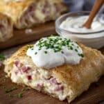 Dieses Handbrot mit Schinken und Käse ist ein herzhafter Snack oder eine leckere Mahlzeit, die einfach zuzubereiten ist. Der Teig wird weich und fluffig, gefüllt mit würzigem Schinkenspeck und geschmolzenem Gouda, dazu eine frische Schmandcreme mit Frühlingszwiebeln und Schnittlauch – perfekt für jede Gelegenheit.
