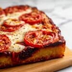 Detroit-style pizza is a thick, rectangular pie known for its crispy edges and cheesy, saucy topping. This homemade vegetarian version lets you enjoy the iconic flavors with fresh tomatoes and a blend of cheeses, all from scratch.