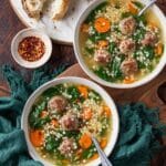 Keywords: Italian wedding soup, meatball soup, chicken broth soup, acini de pepe pasta, Italian sausage, homemade meatballs, comforting soup, easy Italian recipe