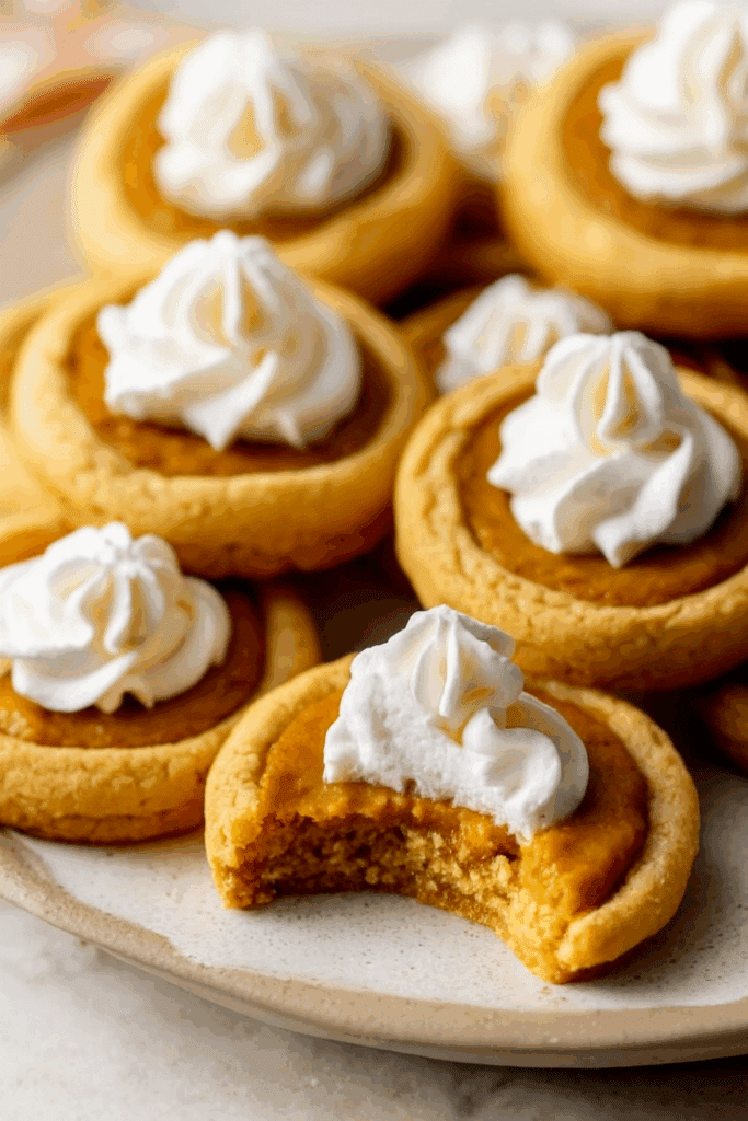 1. Keksteig zubereiten: Butter und Zucker 2–3 Minuten cremig schlagen. Ei und Vanille hinzufügen und gut verrühren. Mehl und Salz mischen und nach und nach unterrühren, bis ein weicher Teig entsteht. Abdecken und 30 Minuten kühlen. 2. Kekse formen und backen: Ofen auf 175°C vorheizen und Backblech mit Backpapier auslegen. Teig zu Kugeln (ca. 1,5 EL) formen, mit Abstand aufs Blech setzen, etwas flach drücken und eine Mulde in die Mitte drücken. 10–12 Minuten backen. Falls Mulde hochgeht, direkt nach dem Backen erneut eindrücken. Komplett auskühlen lassen. 3. Kürbisfüllung zubereiten: Frischkäse glatt rühren. Kürbispüree, braunen Zucker, Pumpkin Pie Spice, Zimt, Sahne und Vanille hinzufügen und cremig mixen. 30 Minuten kühlen. 4. Kekse zusammensetzen: Kürbiscreme in die Mulden füllen, mit Schlagsahne toppen und nach Wunsch mit Zimt oder Muskat bestreuen.