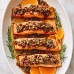 - Glaze and Garnish: Once the salmon is cooked, spoon the warm maple pecan glaze generously over the top. Garnish with fresh rosemary sprigs and sliced tangerines or oranges for added flavor and presentation.