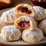 9. Bestäube die abgekühlten Marmeladen-Küsschen großzügig mit dem restlichen Puderzucker und serviere sie frisch.