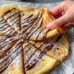 400 ml Milch, 160 g Mehl, 2 Eier, 3 EL Zucker, 3 EL neutrales Öl (z.B. Keimöl oder Sonnenblumenöl), 1 Prise Salz, Puderzucker zum Bestreuen, Schokocreme zum Beträufeln