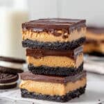 The image shows a stack of three dessert squares, each with three clear layers: the bottom layer is dark, crumbly chocolate cookie crust, the middle layer is thick and creamy light brown peanut butter filling with a smooth texture, and the top layer is a thin, shiny dark chocolate ganache. The squares are neatly stacked on top of each other on a white marbled surface. To the left, there is one chocolate sandwich cookie and a blurred glass of milk in the background, giving a cozy, inviting feel. photo taken with an iphone --ar 4:5 --v 7