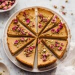 A round tart is cut into eight slices and placed on a white plate, showing a golden-brown crust that is thick and crumbly at the edges. The smooth, light brown filling layer is even and firm. Each slice is topped with chopped green pistachio nuts and small pink dried rose petals scattered across the surface. The plate sits on a white marbled surface with a soft white cloth nearby, and a small white dish holding more dried rosebuds can be seen to the side. Photo taken with an iphone --ar 4:5 --v 7