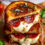 A delicious twist on classic grilled cheese, this Pizza Grilled Cheese sandwich combines melted mozzarella, provolone, and Parmesan cheeses with savory pepperoni, marinara sauce, and optional veggies and meats, all grilled to golden, crispy perfection. Perfect comfort food for pizza and grilled cheese lovers alike.