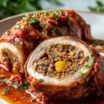 Discover the rich flavors of an authentic braciole, a classic Italian stuffed beef roll simmered in savory tomato sauce. This recipe combines tender flank steak with a fragrant herb and breadcrumb filling, perfect for a comforting meal any night of the week.
