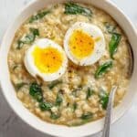 A comforting and nutritious savory oats recipe featuring tender spinach and a flavorful blend of soy sauce and miso. This quick and easy porridge is perfect for a wholesome breakfast or light meal, garnished with optional sriracha and a soft-boiled egg for extra richness.