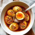 - Combine Eggs and Sauce: Add the peeled eggs to the skillet with the sauce. Cook for an additional 3 minutes, turning the eggs occasionally to ensure they are evenly coated and infused with the savory, spicy sauce.