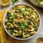 Keywords: spring pasta salad, lemon basil vinaigrette, asparagus pasta salad, vegetarian pasta salad, healthy pasta salad, Mediterranean salad, chickpea pasta salad