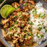 Ein köstliches thailändisches Gericht mit zarten Hähnchenstücken, knackigem Gemüse und einer cremigen Erdnusssauce, verfeinert mit Kokosmilch, Sojasauce und Limette.
