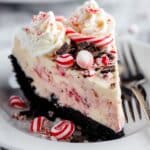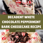 Keywords: White Chocolate Peppermint Bark Cheesecake, peppermint cheesecake, holiday cheesecake, Oreo crust cheesecake, festive dessert