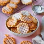 Die Kekse sollten nicht zu lange gebacken werden, damit sie schön knusprig bleiben und nicht zu dunkel werden. Das Waffeleisen muss gut vorgeheizt sein, damit die Kekse gleichmäßig backen. Wenn kein Waffeleisen zur Hand ist, können die Kugeln auch flach gedrückt und im Ofen gebacken werden, allerdings verändert sich dann die Konsistenz.